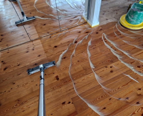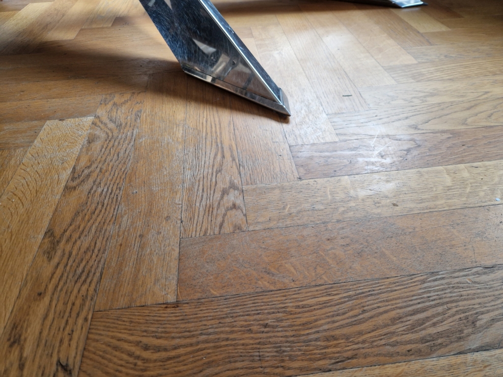 Als Bodenleger für Parkett-Fußböden wissen wir: In manchen Fällen ist es notwendig, ein Parkett mit etwas „schärferen“ Mitteln wieder schön zu machen, wenn sich mit einer Parkett-Reinigung allein nichts mehr erreichen lässt. Auch in solchen Fällen haben wir verschiedene Möglichkeiten der Parkettaufbereitung. Auf Parkettböden mit einem Finish aus Hardwachs-Öl können wir in bestimmten Fällen mit einem speziellen Mattschliff die Oberfläche trocken mit der Tellermaschine säubern. Nach dem Absaugen der Holzoberfläche wird dann eine neue Schicht Hardwachs-Öl aufgebracht, so dass der Holzboden wieder bestens geschützt ist. Die Nutzschicht des Parketts wird dabei nicht angegriffen.
