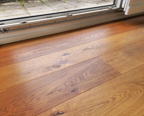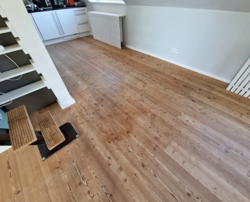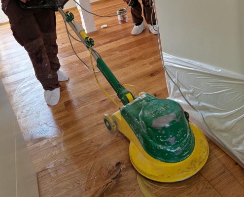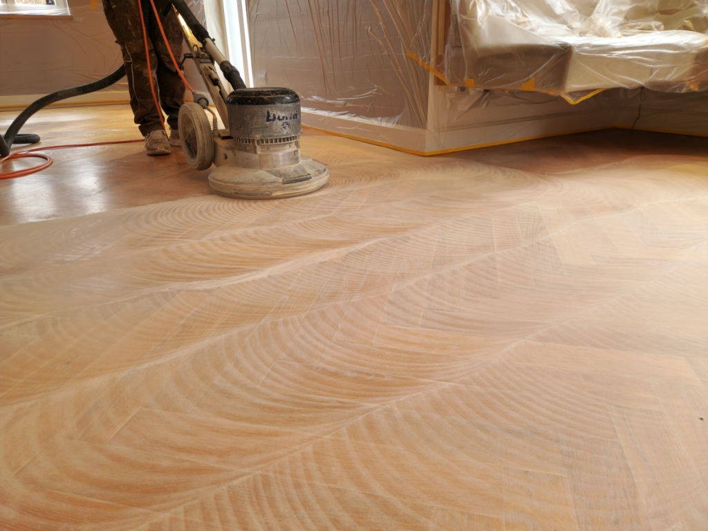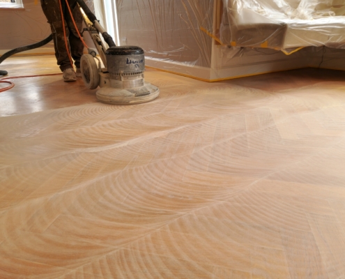 Wenn die Parkettfläche schon deutlichere Gebrauchsspuren und kleine Kratzer aufweist – zum Beispiel bei neuer verlegtem Fischgrät-Massivparkett in Wohnungen und Häusern, welche aber schon einige Jahre bewohnt wurden – kann trotzdem in vielen Fällen auf einen vollständigen Abschliff verzichtet werden. Statt dessen fahren wir die Oberfläche der betreffenden Räume mit unseren Parkettschleifmaschinen mit einem sehr feinen Schleifpapier ab, „säubern“ damit alle Schadstellen und öffnen die Holzporen. Die Nutzschicht verliert dabei nur wenige Zehntel Millimeter und ist dann in der Lage, eine oder zweit Schichten Parkett-Öl aufzunehmen. Kleine Kratzer und Mini-Dellen verschwinden dann beim Nachölen der Holzoberfläche und werden nahezu unsichtbar.