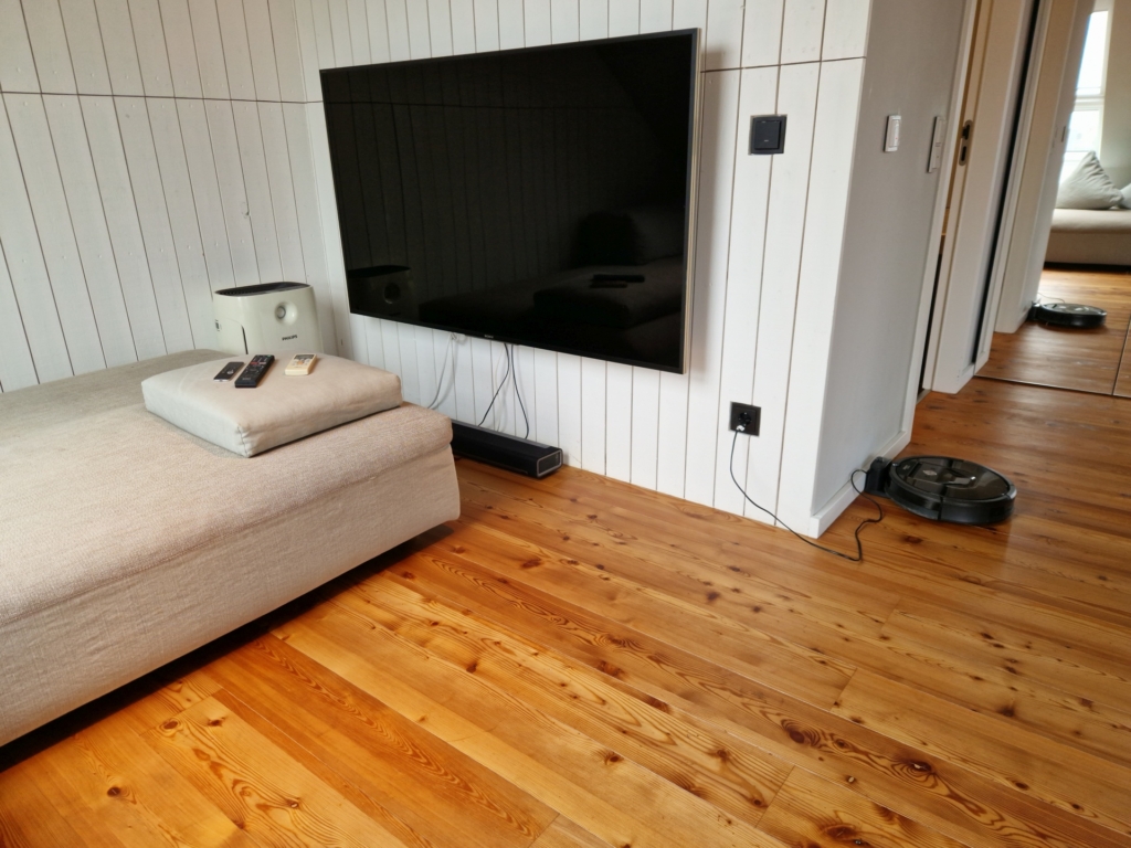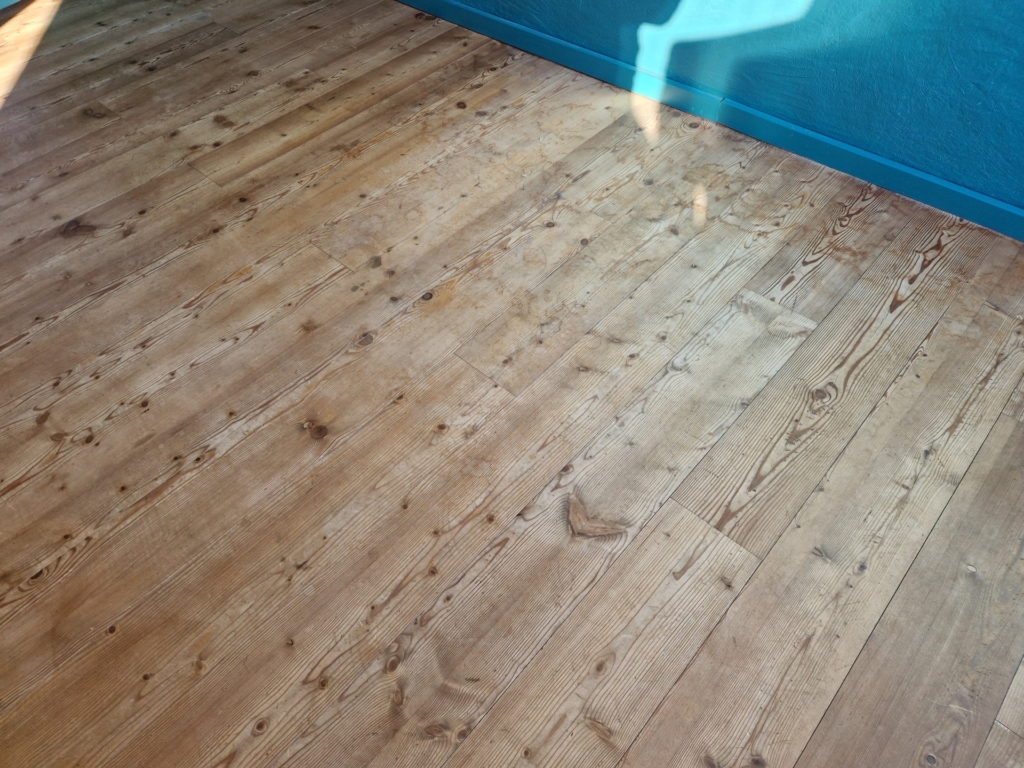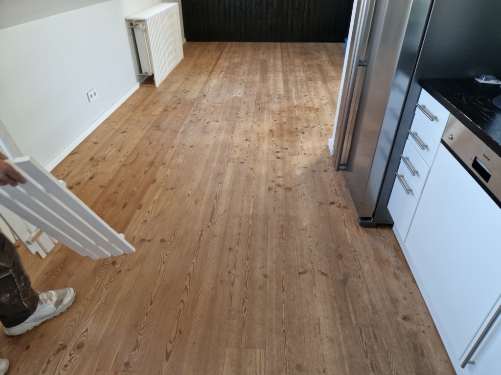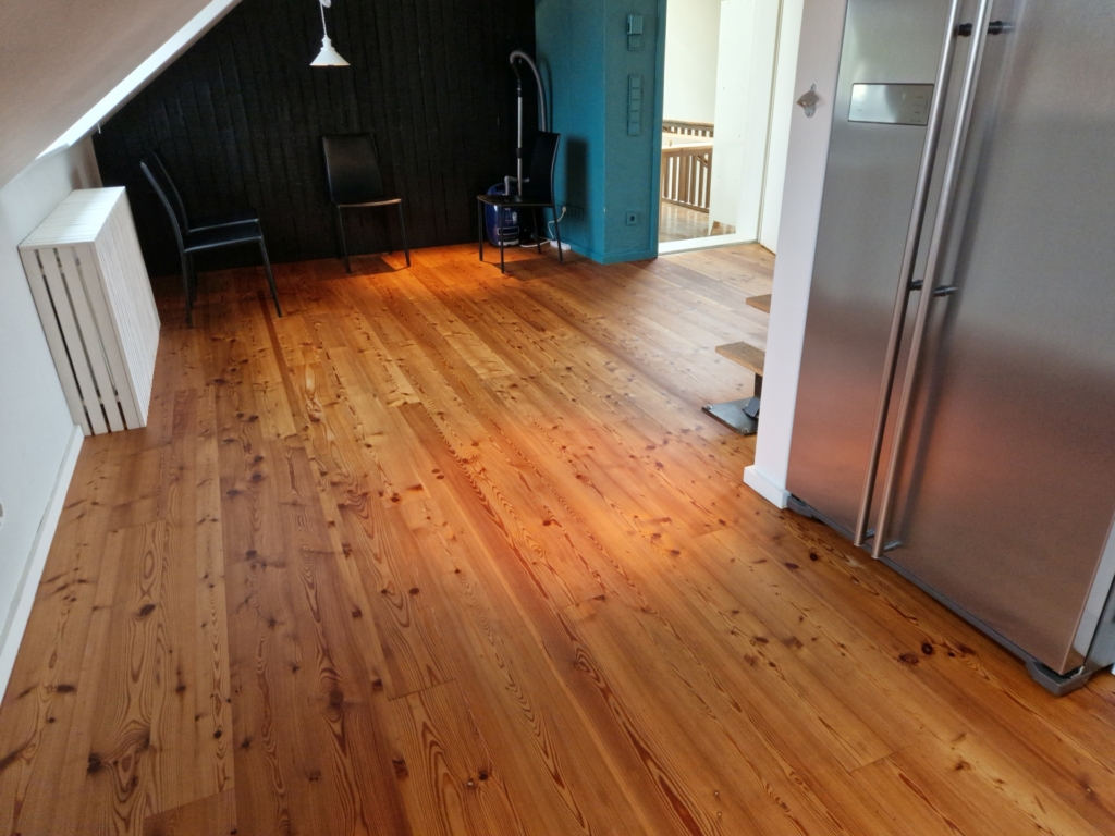 Die Flecken hatten sich also bedingt durch die Saugfähigkeit des Holzes sehr stark ausgebreitet. Weil Kieferndielen mit der Zeit ausserdem sehr stark nachdunkeln, konnten die Verschmutzungen in der Küche nicht mehr lokal entfernt werden, sonst hätte das Parkett nach der „Reinigung“ ausgesehen wie ein Fliegenpilz mit lauter weißen Flecken.