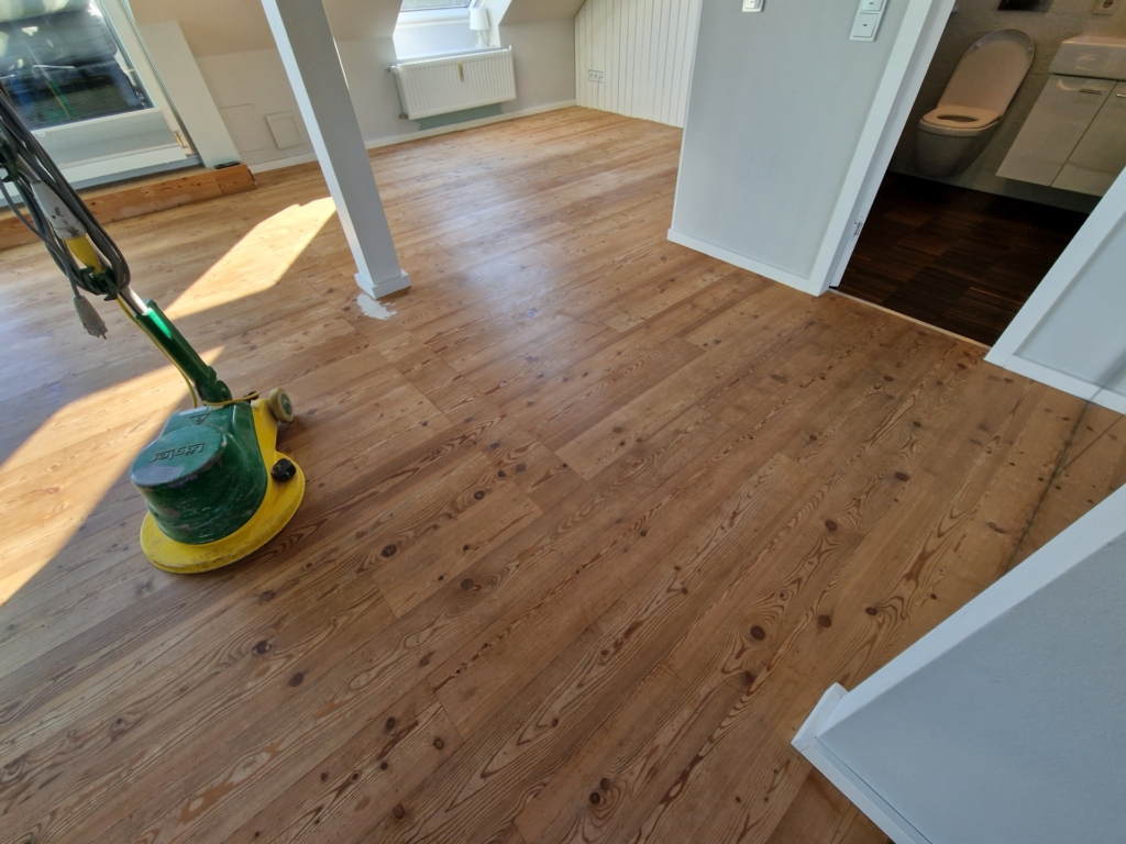 Nach dem Säubern der Parkett-Fläche (und wir konnten wirklich alle Flecken entfernen) durften die Kiefern-Dielen über Nacht bei gekippten Fenstern gut durchtrocknen. Am Abend des darauffolgenden Tages wurde auf das frisch gereinigte Parkett hochwertiges Parkett-Öl der Marke AURO aufgetragen und zwar ebenfalls mit der Einscheibenmaschine, bis zur Sättigung des Holzes.