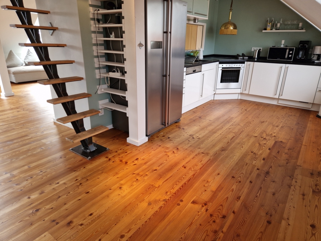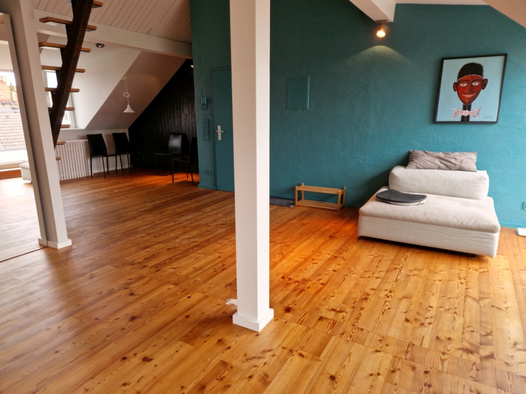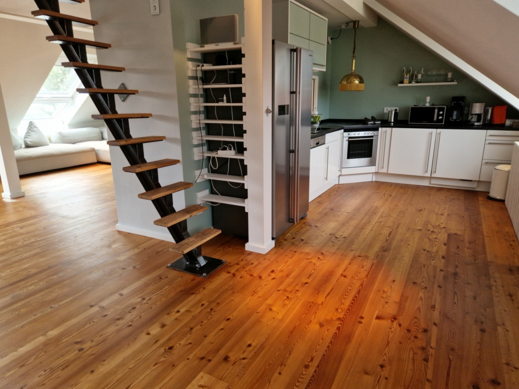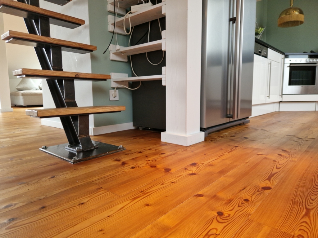 „Auslöser“ des Auftrags war eine geöffnete Dose mit eingelegtem Fisch, der in der Küche neben dem Treppenabgang zum Schlafplatz im Dachspitz dieses schwabinger Lofts auf den Holzboden gefallen war. Ein Eichenparkett hätte dies vielleicht noch mitgemacht, doch in dieser Wohnung unterm Dach war als Parkettboden Astkiefer verlegt.
