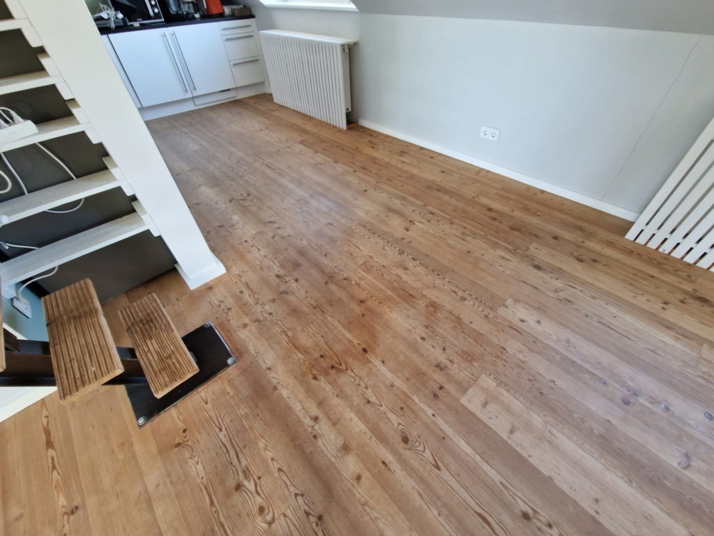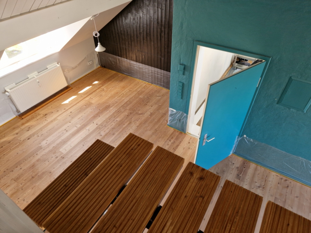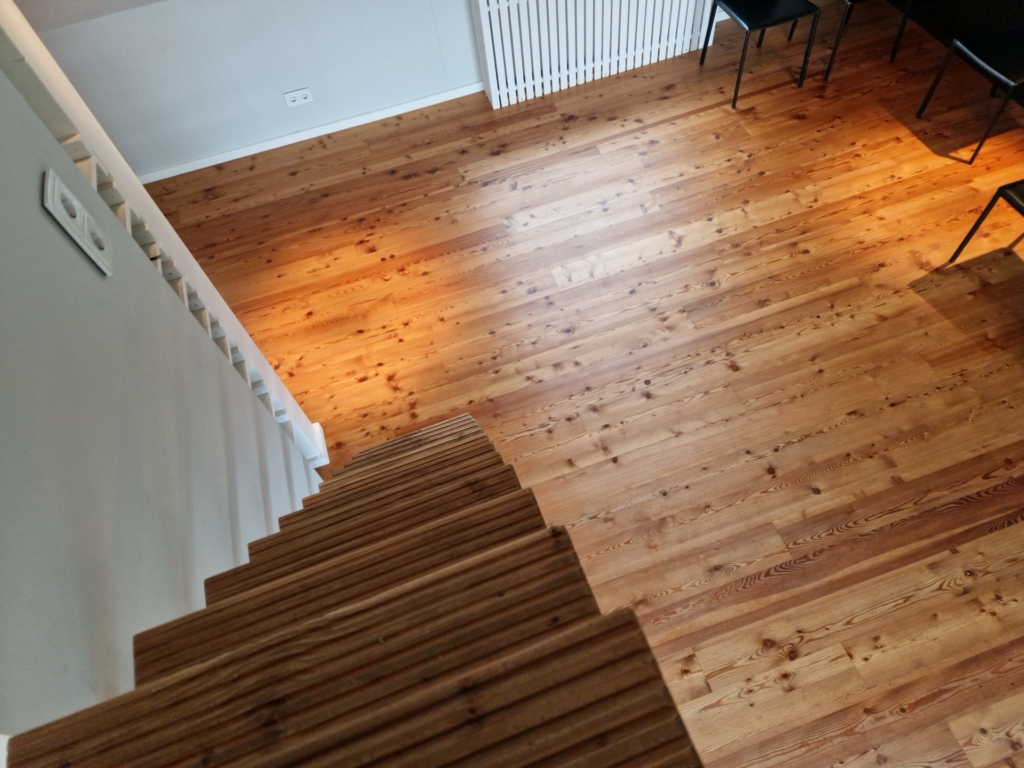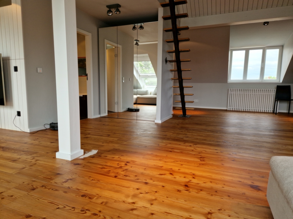 „Auslöser“ des Auftrags war eine geöffnete Dose mit eingelegtem Fisch, der in der Küche neben dem Treppenabgang zum Schlafplatz im Dachspitz dieses schwabinger Lofts auf den Holzboden gefallen war. Ein Eichenparkett hätte dies vielleicht noch mitgemacht, doch in dieser Wohnung unterm Dach war als Parkettboden Astkiefer verlegt.