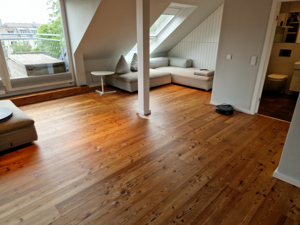 Weil dieses Loft in Schwabing bis auf das Badezimmer (und die Dachterrasse) aus nur einem großen Raum besteht und dieser Parkettfußoden komplett durchgängig verlegt ist, blieb als Alternative nur ein Parkettschliff oder eine Parkettreinigung übrig. Da kaum Kratzer im Parkett vorhanden waren und die Möbel leicht von der Parkettfläche in den großzügigen Hausgang verschoben werden konnten, haben wir dem Kunden eine professionelle Parkettreinigung mit anschliessendem Nachölen empfohlen.
