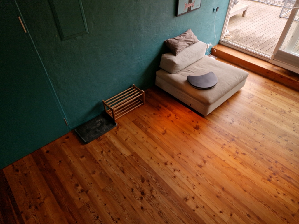 Das verwendete AURO-Parkettöl hat im Topf eine recht geringe Viskosität (also Fließfähigkeit), sobald es aber mit der Parkettmaschine verteilt und etwas einmassiert wird, wird es wundervoll sähmig und der Öl-Anteil dringt sehr tief ins Holz ein. Die Kieferndielen wurden durch das Nachölen des Parkettbodens wieder wunderbar angefeuert und anschließend sorgfältig aufpoliert.